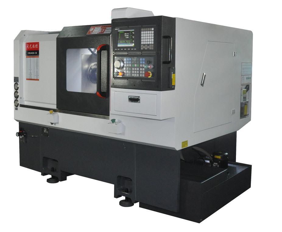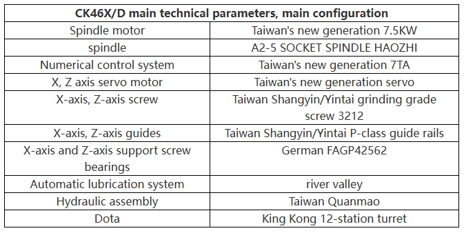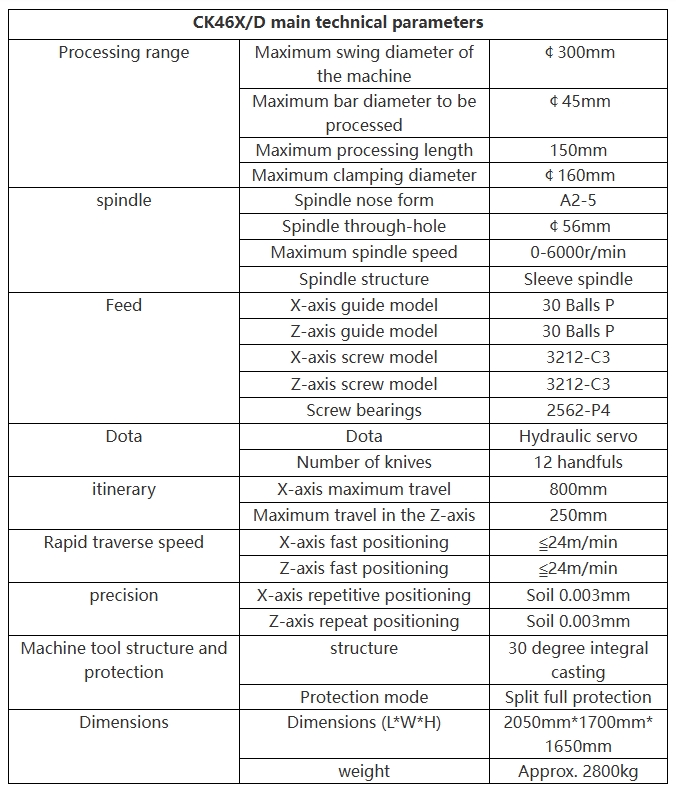 CK46X/D Features: First, the bed body adopts 30° integral structure. The main shaft adopts the sleeve main shaft with standard inner cone structure, hydraulic chuck and spring collet, which can be directly installed. Without the transition flange, the chuck can be quickly replaced. . Second, the machine tool uses eight-station hydraulic turret design, good rigidity, easy chip removal, easy to operate, especially suitable for the processing of disc parts. Third, the main shaft adopts maintenance-free sleeve design. The sleeve main shaft is installed on the center line of the main shaft. The upper and lower parts of the main shaft are heat-balanced, and the heat is spread to the bed as little as possible to achieve the most effective heat release of the main shaft and reduce thermal deformation. Fourth, the machine tool adopts imported precision high-speed silent screw, and adopts double pre-tensioning fixed structure, which makes the rigidity of the machine tool effectively improved, and eliminates the precision variation caused by the cold and hot deformation caused by the machine tool operation. 5. The two-axis guide rail adopts German imported linear guide rail, which has the advantages of good rigidity, high precision, long service life and easy maintenance. Sixth, the screw guide rail adopts liquid automatic lubrication method to effectively protect important parts and extend their service life. Seventh, the use of Taiwan's new generation control system, coupled with Japan's Yaskawa high-speed ultra-precision servo (24-bit encoder), the machine processing accuracy and processing speed has been effectively improved. Eight, this machine is especially suitable for the processing of precision parts such as precision machinery, hardware, automobile, sanitary ware, lighting, optoelectronics and disc parts.