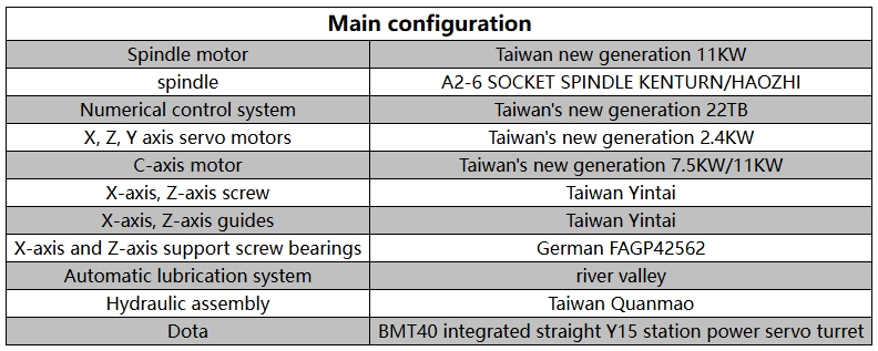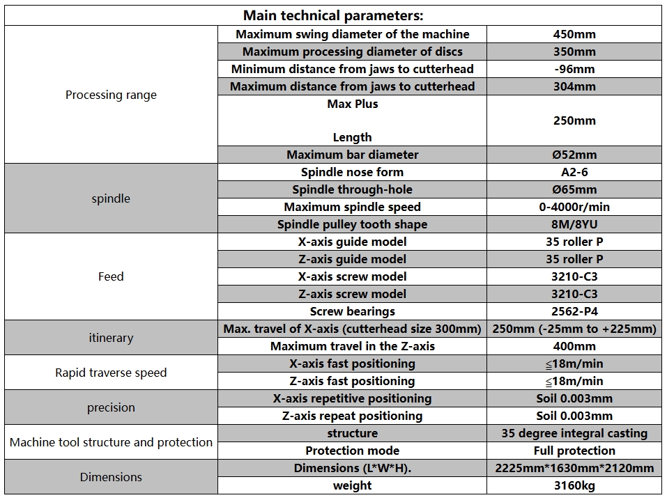 Main technical parameters Processing range: Machine tool maximum rotation diameter 450mm, disc type maximum processing diameter 350mm, minimum distance from gripper to cutterhead -96mm, maximum distance from gripper to cutterhead 304mm, maximum processing length 250mm, maximum bar material processing diameter Ø 52mm, spindle nose end form A2-6, spindle through-hole Ø 65mm, spindle maximum speed 0-4000r/min, spindle belt tooth shape 8M/8YU, feed X-axis guide